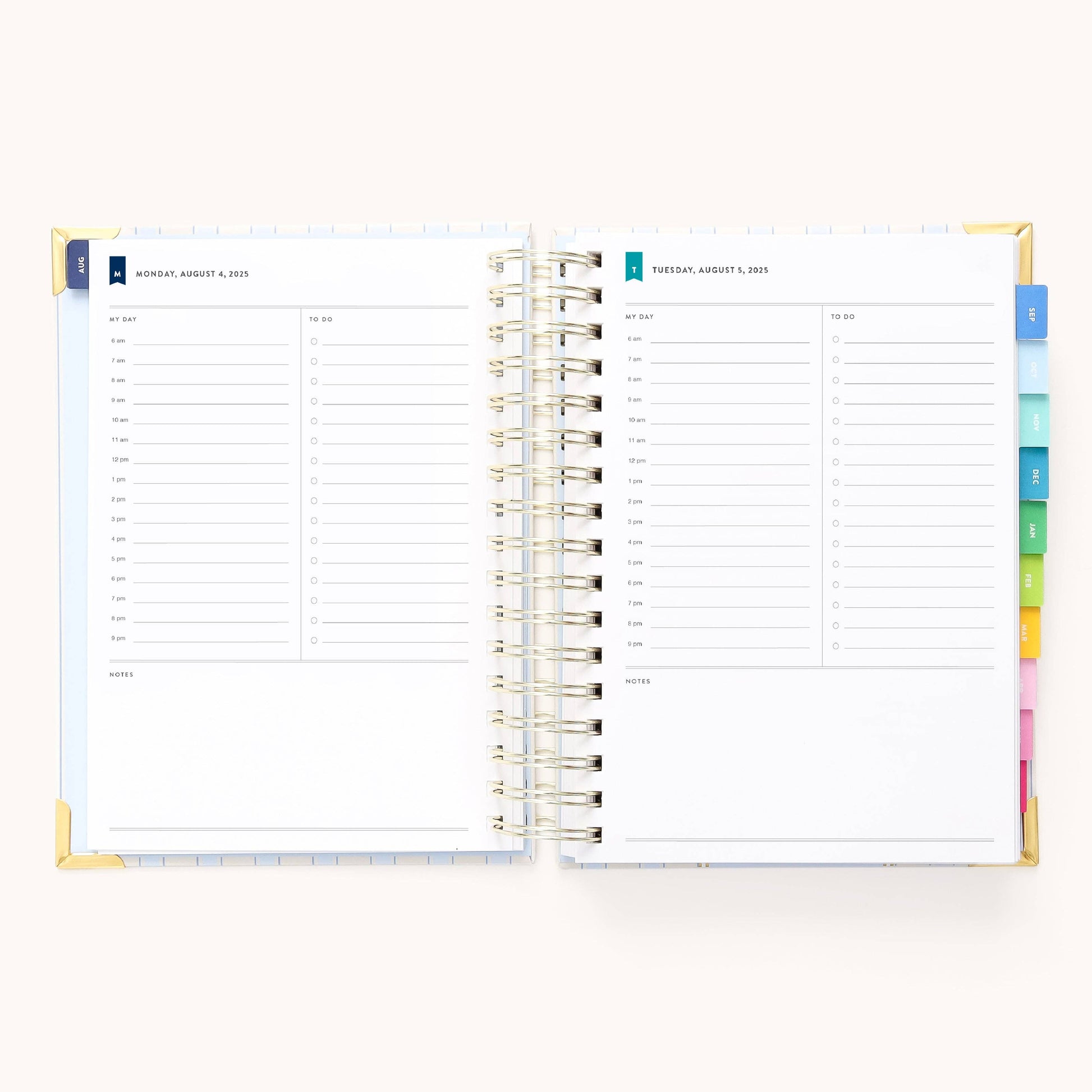 Build a life you love with the Spiral Daily Simplified Planner. Designed with gold wire-o binding, a sturdy hard cover, and a full page for each day. Each spread includes space for your schedule, to-do list, and notes. This planner also includes an interior pocket, colorful sticker pages, and Simplified Prep Work pages. This 12-month edition runs from August 2025 to July 2026.