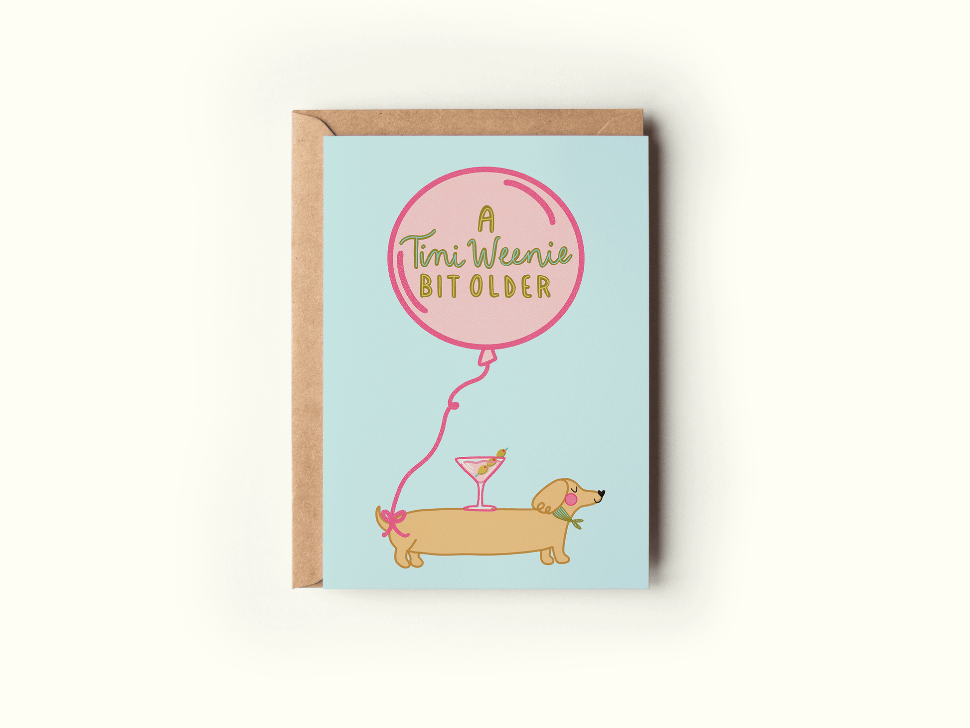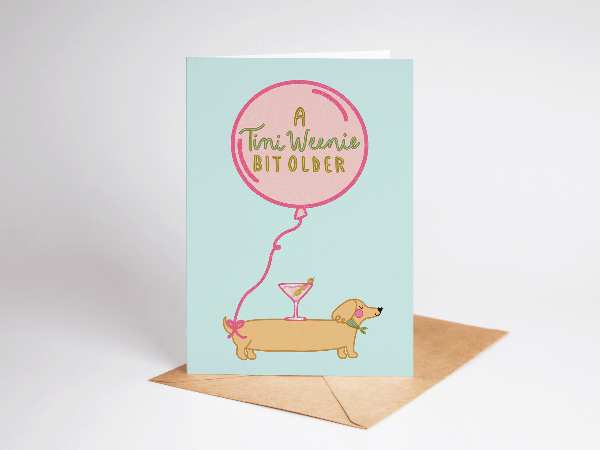 Send a tini weenie birthday wish with this adorable 5x7 birthday card, featuring a pink martini glass carried on the back of a dachshund/weenie dog and the phrase "a tini weenie bit older". The card is blank inside for your own personal message and comes with a brown kraft envelope. Perfect for birthdays, 21st birthdays, martini lovers, dog lovers, and more!