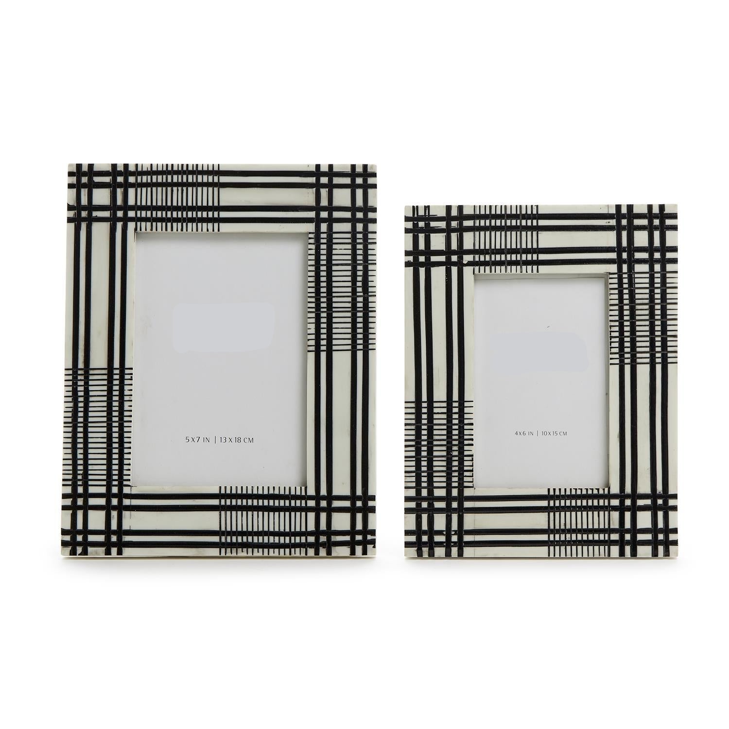 Elevate your cherished memories with this modern plaid set of two black and white photo frames. These frames come in two versatile sizes perfect for displaying 4" x 6" and 5" x 7" photos either horizontally or vertically. The sleek design adds a contemporary touch to any space, making them a perfect addition to your chic home decor.