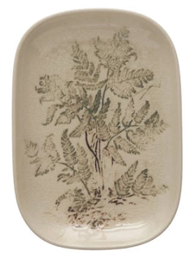 6"L x 4"W Debossed Stoneware Dish w/ Botanical Pattern, Reactive Crackle Glaze, Cream Color & Green, 4 Styles