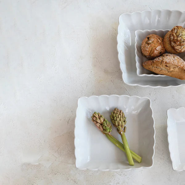 Elevate the dining experience with this set of 4 square stoneware serving dishes with a beautiful scalloped edge in a matte white finish that adds a touch of sophistication and elegance to any table setting. Whether hosting a formal dinner party or enjoying a casual family meal, they seamlessly blend into any setting, from modern and contemporary to farmhouse and traditional.