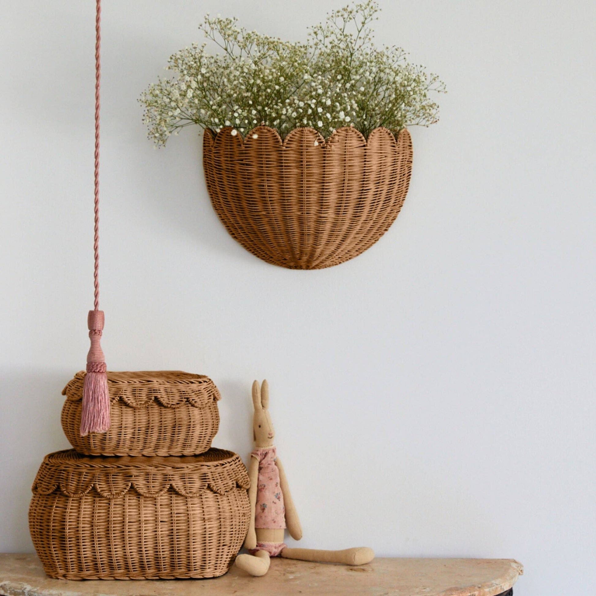 Lola wall wicker basket with Its stunning scalloped edges infuse any space with a touch of sophistication, perfectly blending form and function. The Lola Mocca wall basket is not just aesthetically pleasing but also exceptionally practical. It offers a chic solution for organizing nursery or kids room essentials. Crafted from sustainable and eco-friendly rattan, Lola features a construction that's both sturdy and stylish.