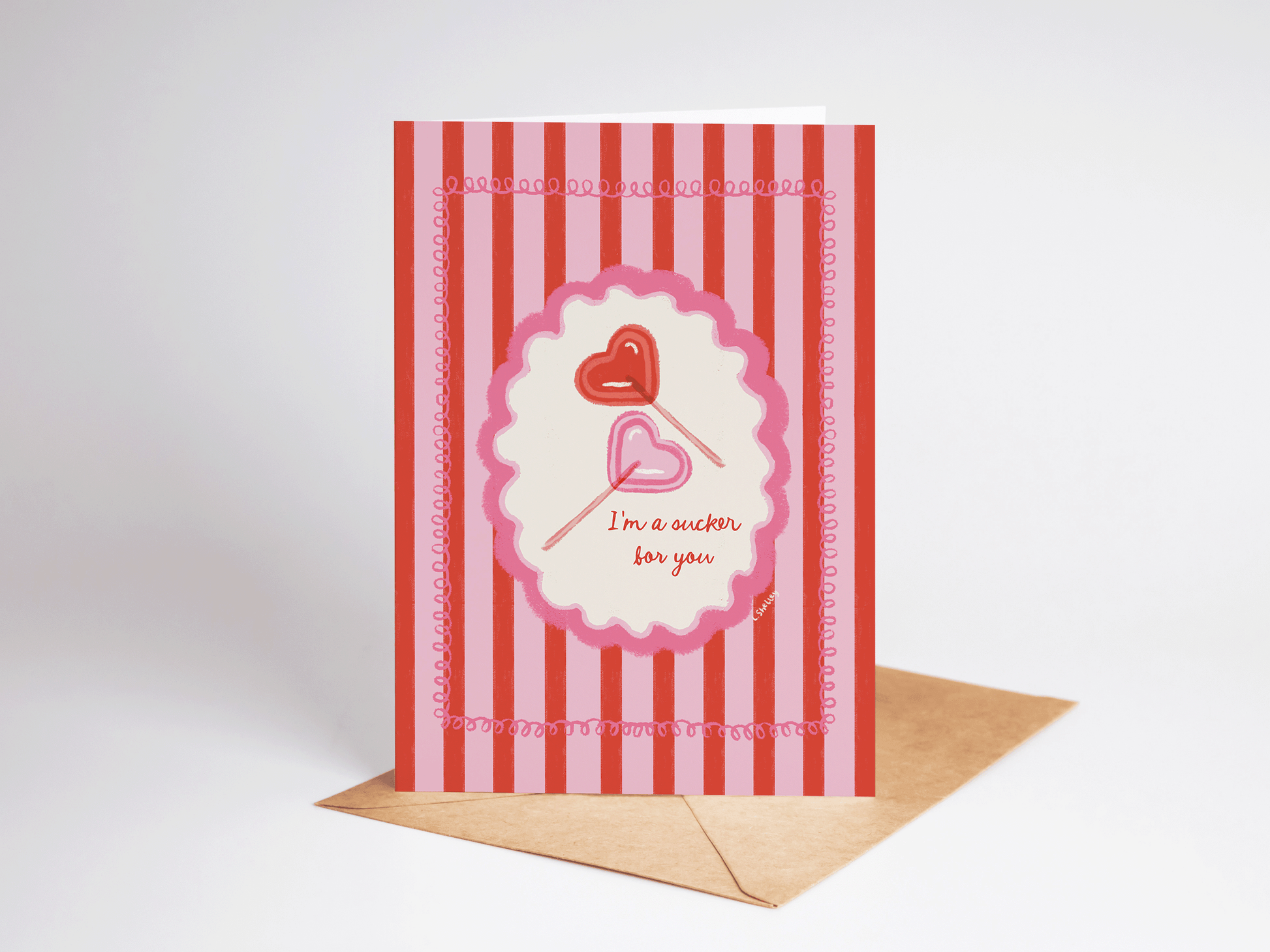 Let them know you're sweet on them with this adorable 5x7 card, featuring red and pink heart suckers and the phrase "I'm a sucker for you". The card is blank inside for your own personal message and comes with a brown kraft envelope. Perfect for Valentine's Day, anniversaries, significant others, dessert lovers, and more!